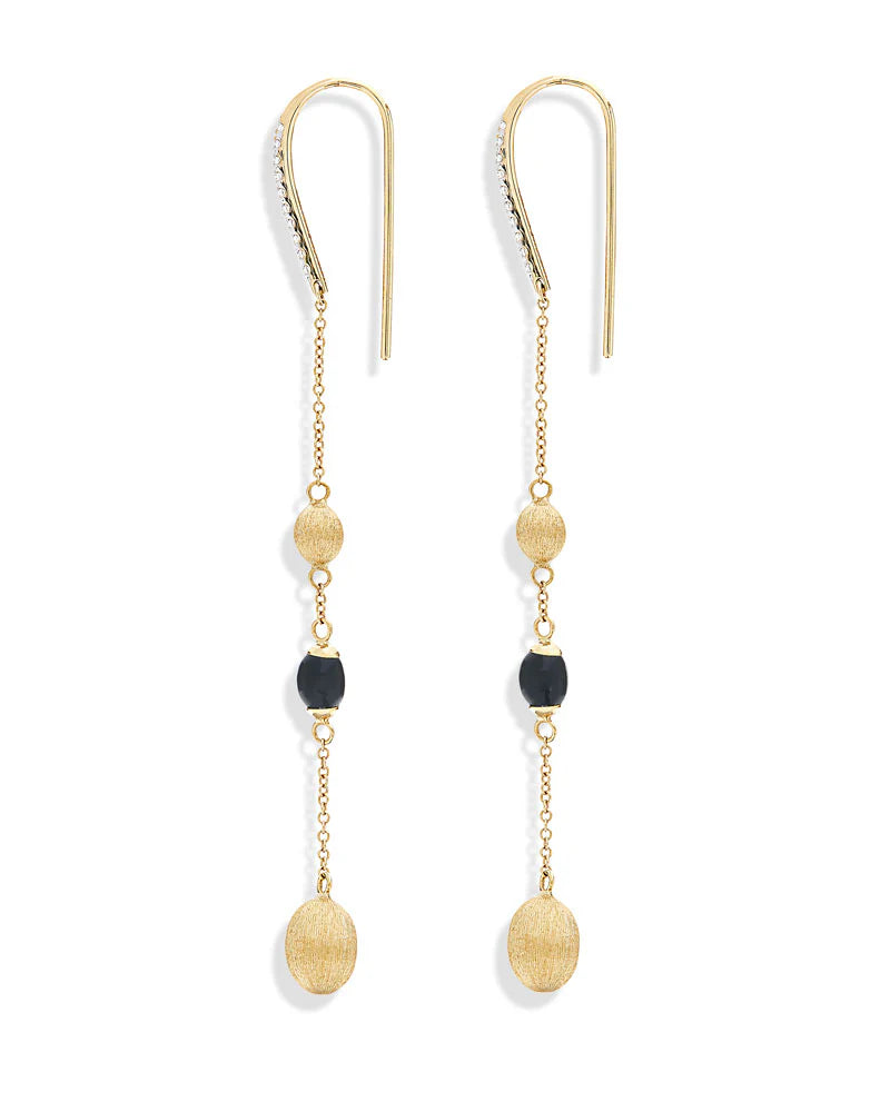 Gocce di pioggia d'oro e di onice, questi orecchini in oro 18 kt e diamanti daranno un tocco di classe e di movimento al vostro look.