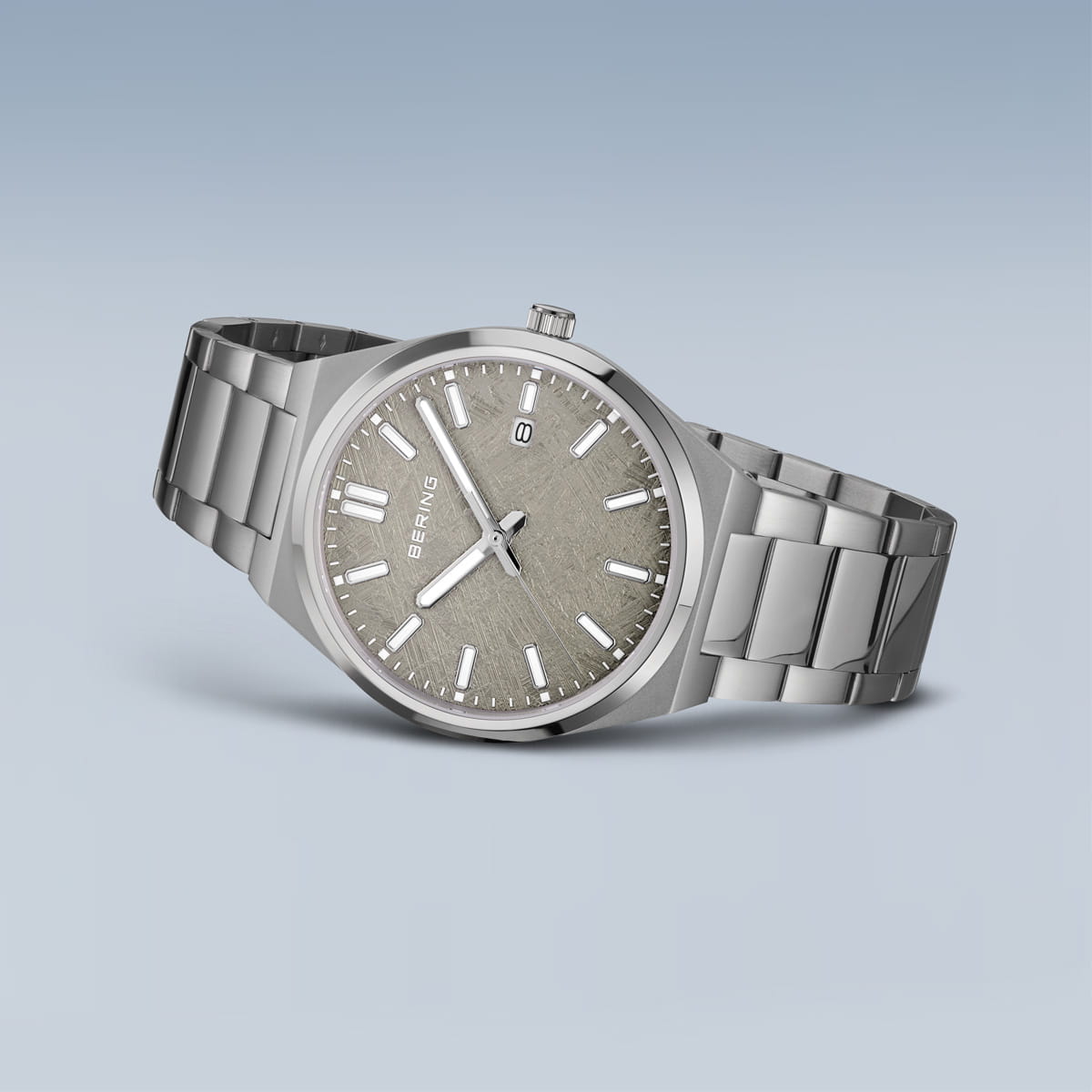 Questo orologio da uomo della collezione Classic di BERING abbina il minimalismo a una forte identità visiva grazie al quadrante grigio con texture a stampa a olio. La superficie ricorda il ghiaccio o la roccia scolpita dal vento – un’estetica profonda, mai eccessiva. Indici applicati e lancette luminose garantiscono leggibilità ottimale, con datario discreto alle ore 3.
