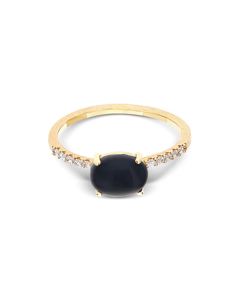 Anello dancing mistery in oro giallo inciso 18kt, onice e diamantiAnello in onice nera, diamanti e oro giallo 18kt interamente realizzato a mano.